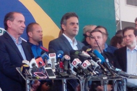 Acompanhado pelo vice, Aloysio Nunes, e lideranças tucanas, Aécio Neves